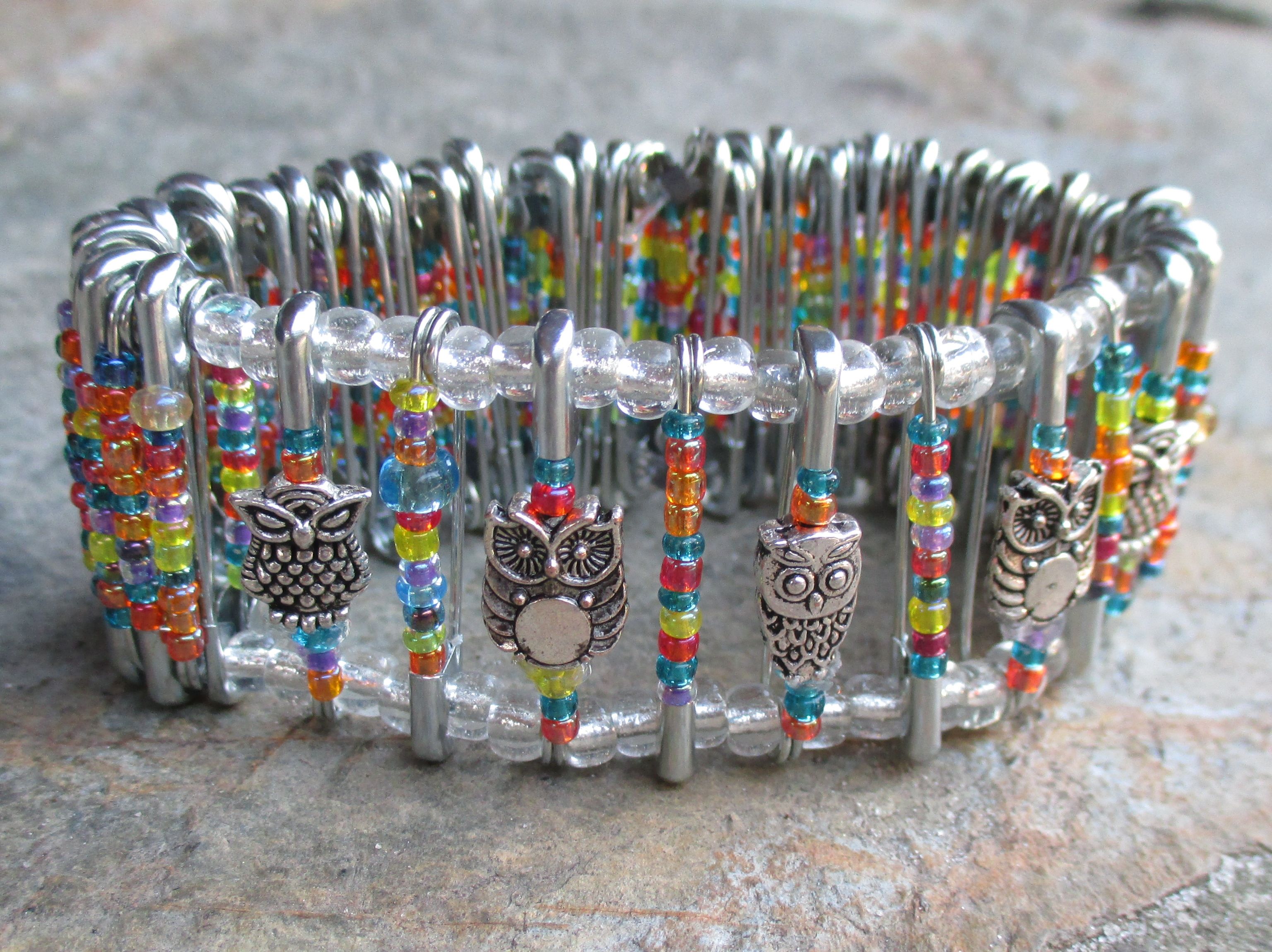 - Еще один необычный браслет, потребует наличия множества английских булавок. Лучше приобрести сразу пару упаковок таких предметов. Помимо этого, потребуется и разноцветный бисер. Работу начинают с нанизывания бисера на острые части булавок. Всего собирают несколько десятков подобных элементов. Когда они будут готовы, через головки и пружинки булавок продевают тонкие резинки и связывают их между собой;