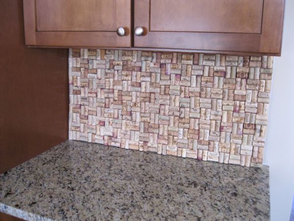 Винные пробки легко решают проблему нехватки денег на закупку кафельной плитки для устройства кухонного фартука, например, между столешницей и навесным шкафом. Если стена ровная, то их наклеивают на нее сплошным ковром. Можно заготовить основу из фанеры под размер участка стены и приклеить пробки на нее.