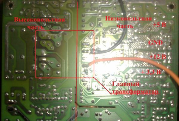 Вначале занимаются блоком питания. Выпаивают из него провода, оставляя на месте те, которыми выполняется подключение к сети питания 220 В, и в зеленой изоляции. Последний проводник сразу же припаивают к «минусу» – к месту, где ранее был прикреплен черный провод. Зеленый провод, при замыкании на корпус, отвечает за запуск блока – то же происходит, когда нажимают кнопку, включающую в работу системный блок.