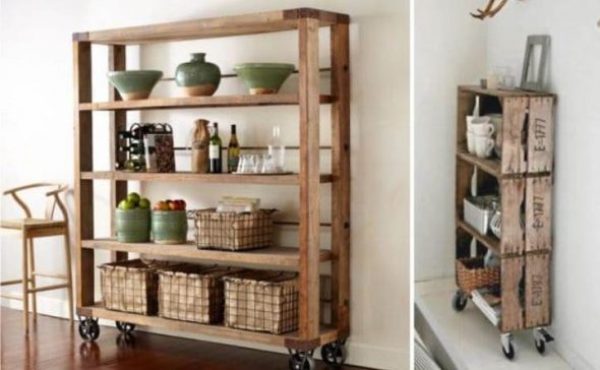 Компактный стеллаж из металла или дерева достаточно прочен и не занимает много места. Купить его можно в супермаркетах или специализированных магазинах, а хороший качественный стеллаж не составит труда смонтировать любому домашнему мастеру из имеющихся в наличии материалов.