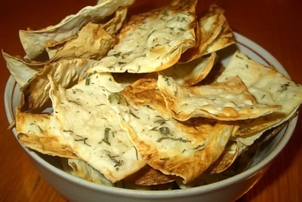Интересен рецепт чипсов из… тонкого лаваша. Получается острый гарнир, который хорош к салатам. Хотя чипсы едят и отдельно. Для приготовления чипсов используют армянский лаваш, сметану (100 граммов любой жирности), зубчик чеснока, сухой укроп (15), соль.