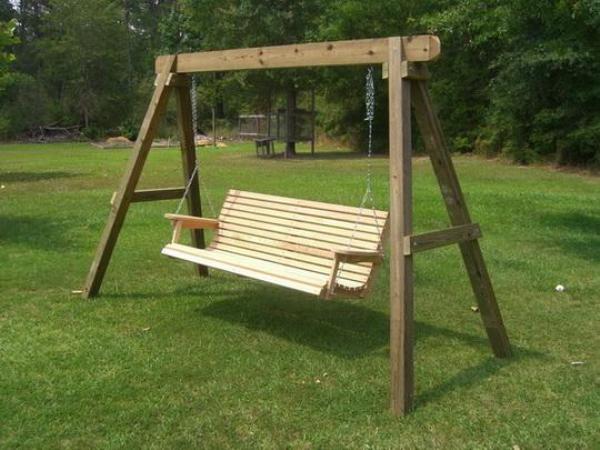Дерево является самым распространённым вариантом для создания качелей. В зависимости от того, какой груз будут поднимать качели, нужно выбирать сечения пиломатериалов для стойки и перекладины (чем больше нагрузка, тем больше сечение соответственно). Чтобы сделать скамейку, стоит взять каркас с сечением 70х40 мм, высоты спинки достаточно в 600 мм, а сиденье должно располагаться не менее, чем на 480 мм.