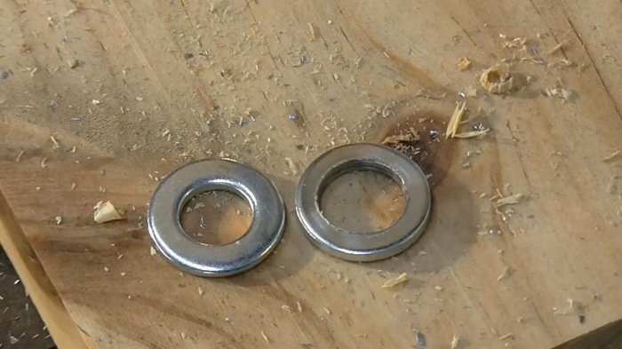 - Брусок может еще пригодиться. Шайбу нужно подковырнуть, так как она под давлением наверняка впечатается в дерево. Мелкие огрехи легко устраняются с помощью мелкого напильника;