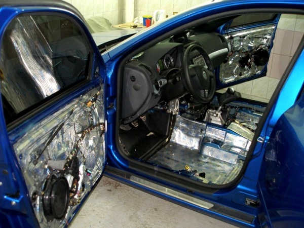 Перед проведением данной процедуры на днище необходимо снять сидения и покрытие пола. После этого на него наносят антикоррозийную смесь. Когда она высохнет укладывают шумоизоляцию, в качестве которой используют войлок синтетический. Дополнительной мерой здесь является укладка поролона под задние сидения. Это снизит шум КПП и выхлопной системы.