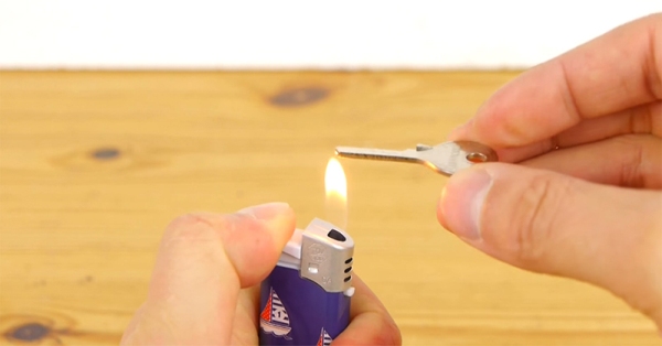Процесс требует наличия под рукой: одноразовой зажигалки, клейкой ленты (ширина 12, 15 мм), ножниц по металлу, куска толстой жести (подходит от консервной банки, эмали), плоскогубцев. Вначале оригинал ключа зажимают плоскогубцами, включают зажигалку и коптят ее огнем рабочую сторону, на которой имеются зубчики.