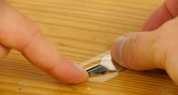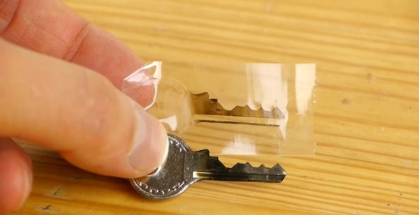 Ключ с почерневшей поверхностью кладут остужаться. После приклеивают к ней полоску скотча, хорошо приглаживают пальцами. Ключ осторожно отрывают от клейкой ленты; на полоске последней будет виден силуэт оригинала ключа. Сверяют визуально полученное изображение с оригиналом и, если отпечаток хороший, то переходят к следующей операции.