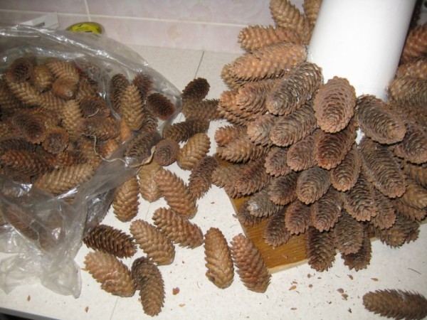 Шишки подходят еловые и сосновые. Их, после заготовки, очищают. Удаляя застрявший мусор, хорошо высушивают. После раскладывают на газете и красят аэрозольной краской в золотой или серебряный цвет.