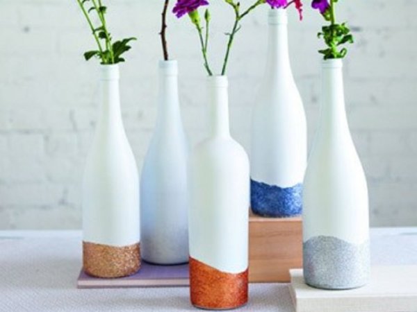 Сделать мини вазу из пустой бутылки несложно. Самый простой вариант – отрезать у нее горло, увеличив отверстие, в которое поместится несколько цветов. Сделать это можно стеклорезом, болгаркой, ножовкой по металлу. Края реза нужно обязательно сгладить мелкой наждачной бумагой.