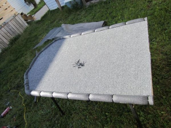 Заготовки настила переворачивают и, используя аэрозольный клей, приклеивают к их верхним плоскостям ковровое покрытие. После высыхания клея ножницами обрезают материал по периметру слани.