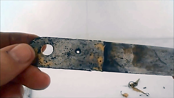 - Процесс идет правильно, если вода вокруг гвоздей начнет пузырится, а отверстие станет темнеть. Если пузырьки образуются вокруг заготовки, надо поменять полярность, перекинув провода;