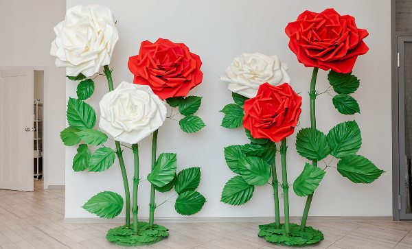 Для украшения комнаты либо помещения на время торжества или просто для драгирования интерьера используют гигантский цветок. Чтобы выполнить работу качественно, для начала можно потренироваться и сделать небольшую розу с любого подручного материала.