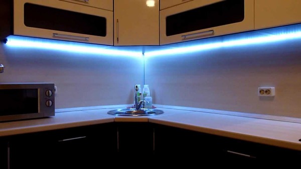 Для устройства подсветки можно применять два вида светодиодных светильников, отличающихся плафонами, которые бывают матовыми, прозрачными. Их легко и просто разместить на гарнитуре, стене. К примеру, можно использовать линейные светильники, которые выпускаются длиной 30, 60, 100 см, отличаются скрытным размещением светодиодов. Указанные светильники могут соединяться между собой для образования какой-либо композиции.