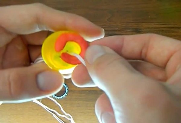 В получившейся детали, в пределах поверхностей крышек, устраивают два сквозных отверстия. Через них пропускают нитку, шнурок длиной 1,2…1,25 м, связывают концы, образуя из них кольцо.