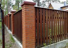 Вид деревянного забора с кирпичными фундаментом и стойками