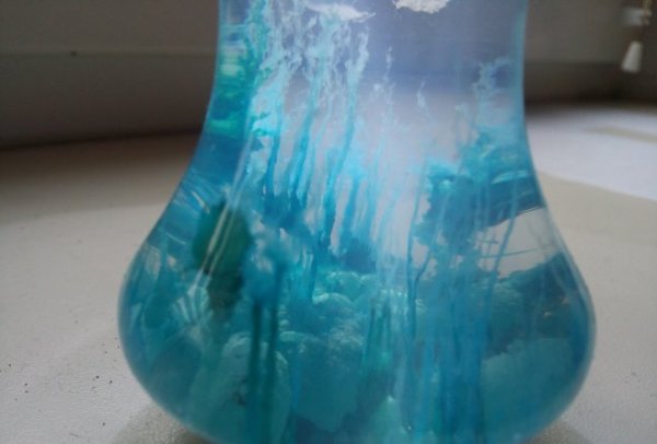 Делаем смесь из воды и жидкого стекла (пропорция 2:1). Примерный объем раствора, должен равняться объему лампочки. Небольшое количество медного купороса, насыпаем на дно лампочки. Затем заливаем получившуюся смесь. Через некоторое время, вашему взору предстанет очень красивая картина, вы увидите, как растут сине-голубые водоросли.