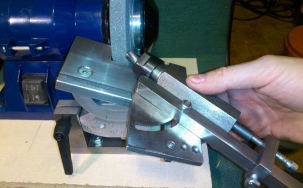 Самое простое приспособление – кусок деревянного бруса, срезанного по косой на угол, обеспечивающий нужное положение сверла относительно наждачного круга при затачивании. Недостаток его в необходимости придерживания сверла рукой, что трудно даже для опытного человека.