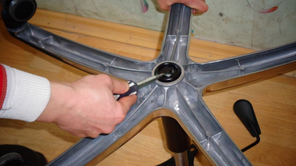 Теперь переходим к разборке кресла. Отсоединяем спинку и сидение от основной конструкции путем откручивания четырех крепежных болтов. Далее, необходимо снять амортизатор с колесной базы. Для этого нужно всего лишь вытащить шпильку. Разобрав конструкцию кресла, можно приступать к починке лифта, точнее, к его фиксации на нужной нам высоте.
