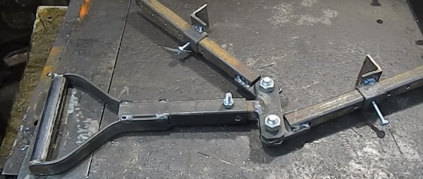 Поперек последних пластин, по их центру приваривают отрезок профильной трубы 20х20 мм, который входит телескопически в кусок трубы, приваренный к ручке.