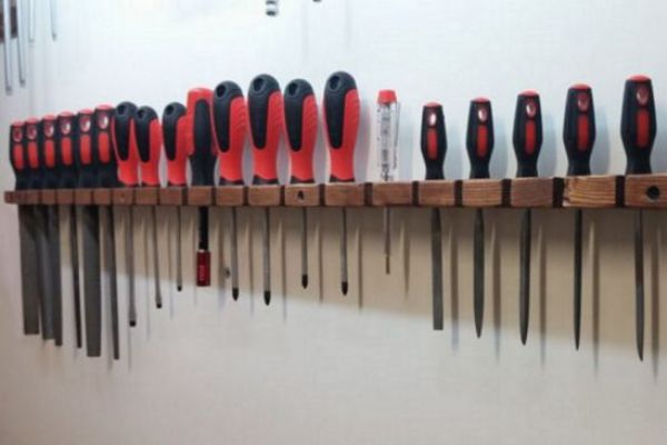 Какие делать настенные держатели зависит от инструментов, которые будут на них размещаться. Вариантов, предлагаемых умельцами, много. Часть их основана на применении магнитов, есть идеи, в которых применяются только деревянные рейки. Последние для многих ближе из-за возможности сделать все четче, красивей.