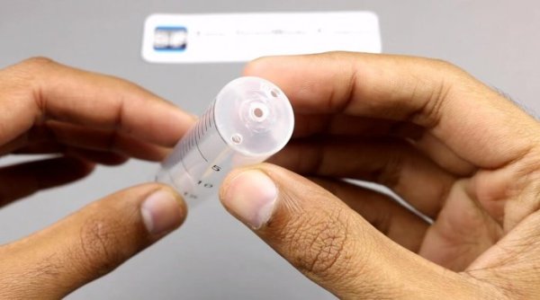 К литиевому аккумулятору крепят клеммы, оборудованные контактами; вставляют батарейку вовнутрь шприца. При этом корпусом батарейки зажимают медные контактные провода от светодиода.