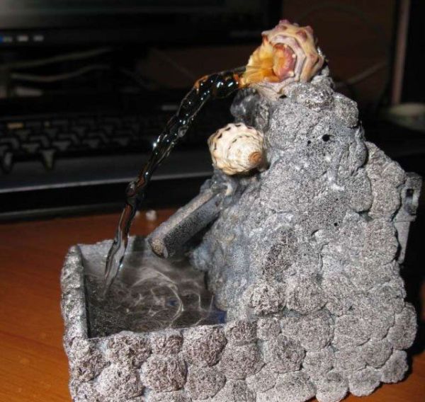 Чтобы обзавестись водопадом, фонтаном, можно отправиться в магазин и купить его там. Можно приложить некоторые усилия и изготовить его самостоятельно. Для этого обзаводятся: небольшим моторчиком (имеется внутри телефона, фотоаппарата); пластиковой шестеренкой из, например, игрушек; пластиковой коробкой небольшого размера; куском листового пластика толщиной примерно 1 мм; крышкой с ПЭТ-бутылки; аккумулятором, который используется в мобильном телефоне; колпачком, которым закрывается дезодорант; фольгой; ракушками; шариковой ручкой; светодиодами; проводами.
