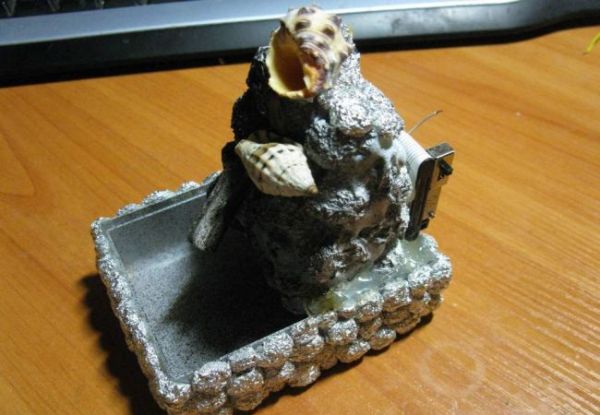 Помпу размещают в ванночке, предварительно защитив двигатель от влаги. Накрывают сверху горкой, при этом трубку подачи воды снабжают трубочкой, конец которой выводят к вершине горки – к месту начала водопада, фонтана. Путь падения воды декорируют ракушками, другими элементами.