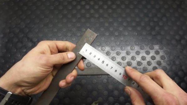 Начинают с разметки отверстий на металлических полосах. Применяют линейку, керн. Координаты отверстий: первого – 15 мм от конца пластины и 8 мм от одной из ее длинных сторон; второго – 11 и 55 мм, соответственно. С другой стороны полосы размечают осевое отверстие, отступая от края 12 мм.