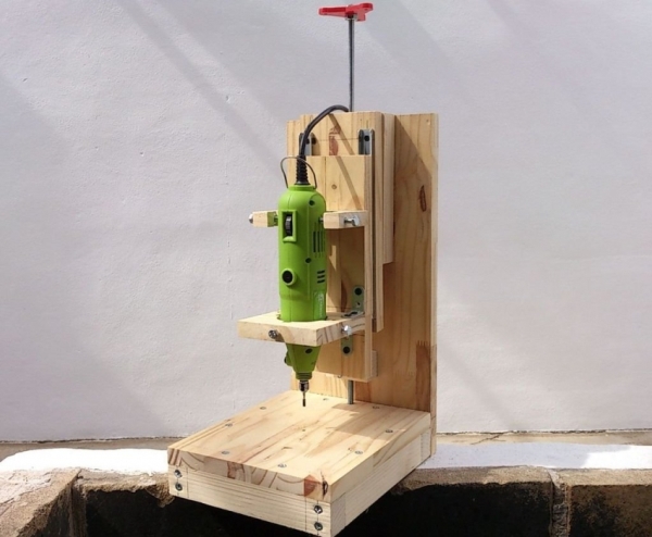 Схем самодельных деревообрабатывающих станков много. Большинство из них требует изготовления рамы, на которой располагают все основные узлы устройства. Но если в мастерской имеется верстак, у которого ровная и прочная поверхность, то можно обойтись без станины. Переднюю бабку и вращательный привод делают на основе дрели. Инструмент можно прикрепить к поверхности верстака через деревянный кронштейн в области шейки, используя для этого хомут, струбцину.