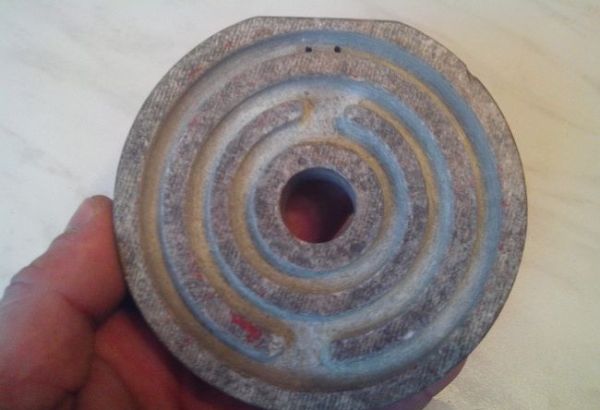 Нагревательный элемент изготавливают в виде миниэлектроплитки. В ней есть осевое отверстие, благодаря чему плитку размещают под основным узлом и крепят к верхнему основанию. Сверху конструкцию снабжают металлическим абажуром (подходит от старой лампы), у которого отрезают дно. В его верхнюю часть вставляют кольцо, устроенное из полоски белого линолеума. Обе детали предохранят руки от разлетающихся горячих частичек сахара, сахарной пудры.
