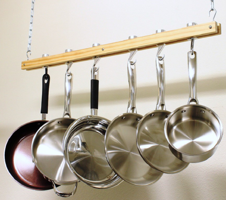 Помимо определения места для хранения, нужно еще и обеспечить быстрый и легкий доступ ко всем предметам, независимо от частоты их использования. Например, сковороды имеют немалые габариты и хранение их внутри духовки не лучший вариант. Если позволяет высота тумбы разделочного стола, сковороды можно подвесить к ее внутренним стенкам или с внутренней стороны дверцы. Для этого нужно предварительно оборудовать эти места металлическими крючками.